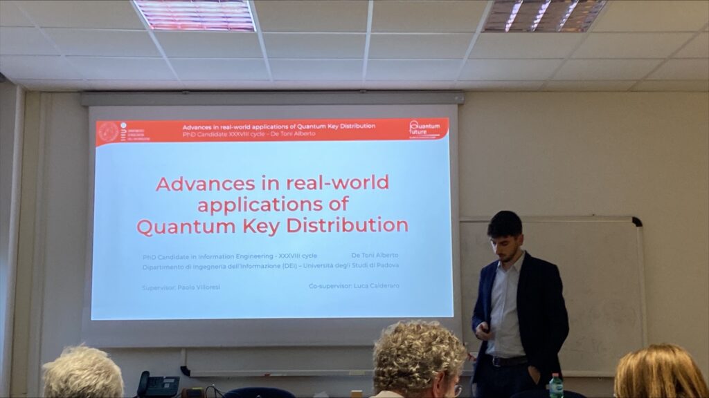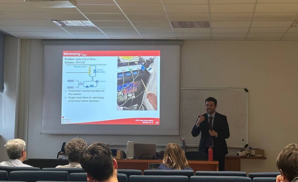 Dr. Alberto De Toni presented his thesis, titled “Advances in real-world applications of Quantum Key Distribution”, which addresses the challenges of speed, stability, and security in transitioning Quantum Key Distribution (QKD) from laboratory environments to real-world applications. His work introduces a complete theoretical model and novel symmetric designs for Sagnac-based optical modulators, overcoming traditional repetition-rate limitations to achieve stable operation speeds exceeding 1.5 GHz. These high-performance encoders facilitate the realization of a robust polarization-based QKD system which, developed for the QUANGO project, demonstrated exceptional secret key rates over both fiber and urban free-space links. The framework is further extended to the deployment of VenQCI, a 4-node metropolitan network integrating quantum layers with commercial telecom infrastructure, alongside a rigorous security analysis of the optical hardware against Trojan-Horse attacks. His thesis aims to bridge the gap between component-level innovation and deployed infrastructure, paving the way for scalable and unconditionally secure global communication networks.