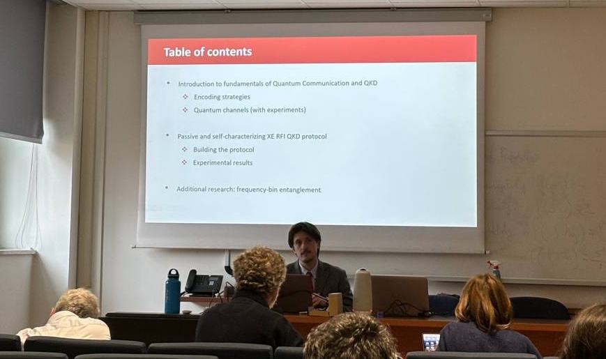 Dr. Massimo Giacomin presented his thesis, titled “Advanced quantum communication system based on reference-frame-independent configuration”, which addresses the urgent need for unconditionally secure encryption in an era where advancing quantum computing power threatens traditional cybersecurity. His work focuses on the evolution of Quantum Key Distribution (QKD) protocols designed to function reliably in harsh conditions by mitigating the strict requirements for alignment between communicating parties. Specifically, the thesis investigates the family of Reference Frame Independent (RFI) protocols, proposing a robust alternative that relaxes the constraints of a shared reference frame which typically demands complex control schemes. This innovative approach utilizes an advanced self-calibration technique at the receiver, capable of characterizing and accounting for physical imperfections to distill cryptographic keys with a high level of security. His thesis aims to enhance the resilience and practicality of quantum communication systems, offering a reliable solution for global networks that guarantees secrecy against even the most powerful future computational threats.